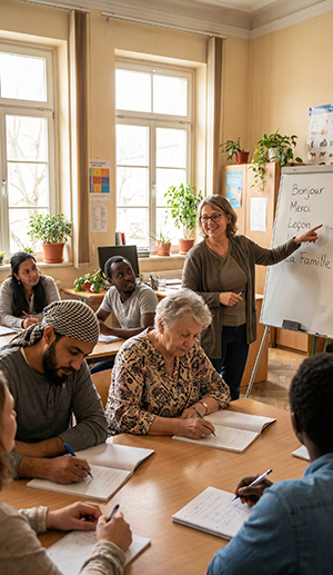 L’ONG Bien-Être International propose un programme d’alphabétisation et de formation linguistique pour répondre aux difficultés rencontrées par de nombreuses personnes immigrées faibles compétences en lecture et écriture, obstacles à l’emploi, démarches administratives complexes et coûts élevés. Le programme offre un parcours progressif du niveau A1 à C2 : une phase d’alphabétisation et de bases essentielles, gratuite, pour apprendre à lire, écrire, comprendre et se préparer aux niveaux A1–A2 ; une phase de consolidation et d’intégration, avec participation symbolique, pour renforcer l’expression orale et écrite, préparer les niveaux B1–B2 et accompagner les démarches administratives ; enfin, une phase de maîtrise linguistique, à forfait réduit, pour atteindre les niveaux C1–C2, développer une expression professionnelle et soutenir les projets exigeants.