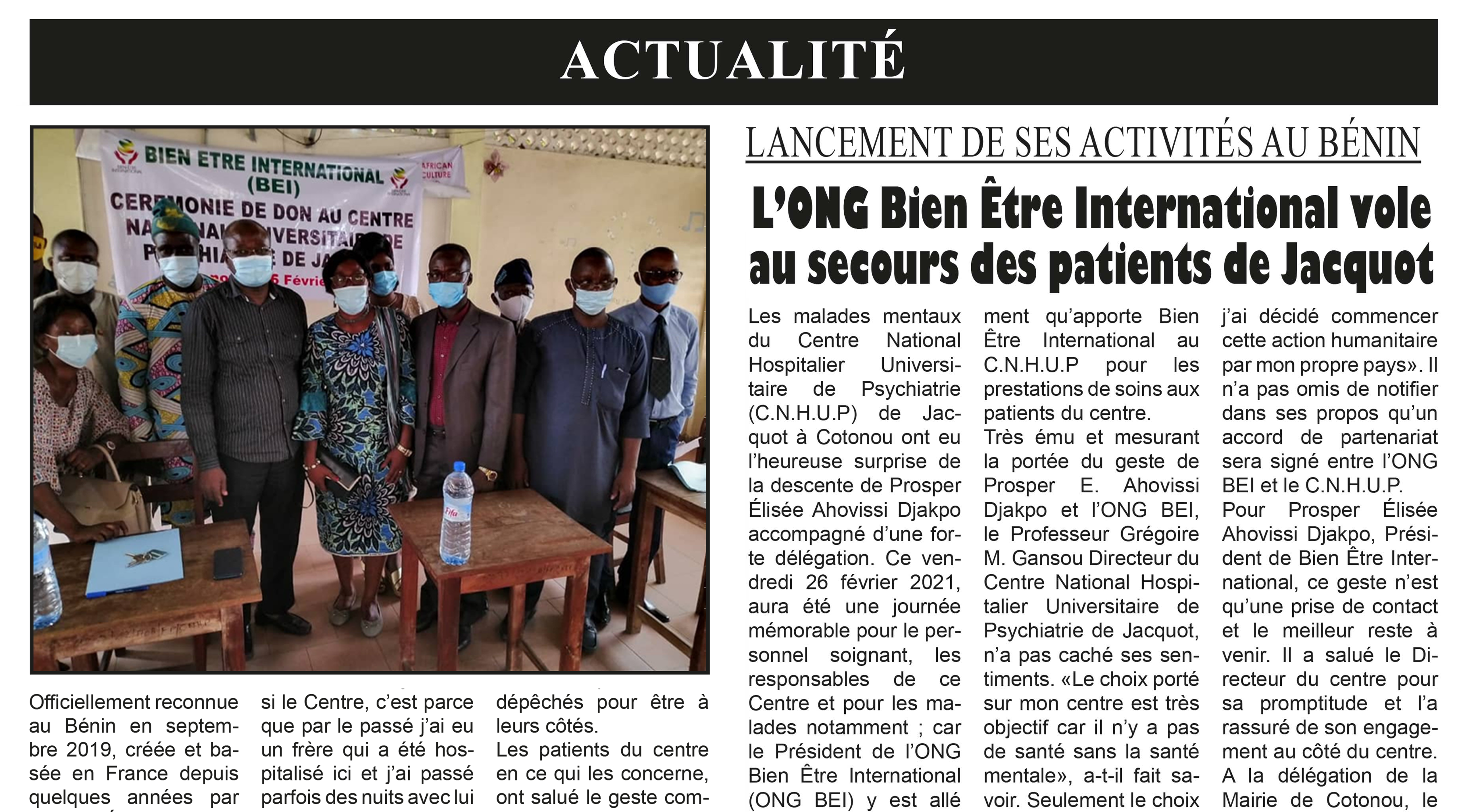 Le vendredi 5 mars 2021, le quotidien béninois Libération a consacré un article au lancement officiel des activités de l'ONG Bien-Être International (B.E.I) au Bénin. Ce retour aux sources a été marqué par une action humanitaire d'envergure au Centre National Hospitalier Universitaire de Psychiatrie (C.N.H.U.P.) de Jacquot à Cotonou. Le journal a relaté la visite de Prosper Élisée Ahovissi Djakpo, Président de B.E.I., et d'une forte délégation, venus apporter un soutien concret à une structure souvent en manque de moyens.